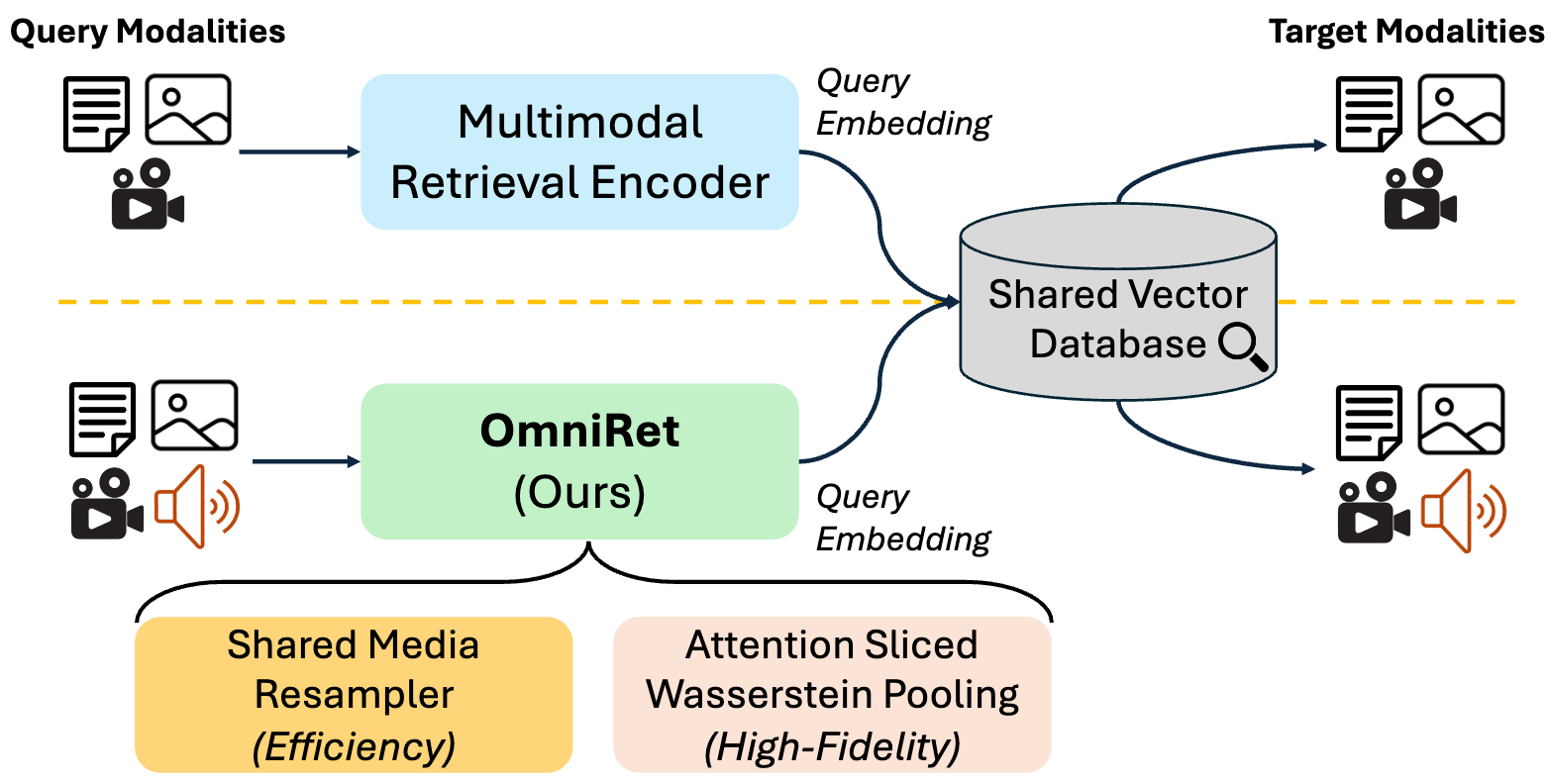 The first universal retrieval model for text, vision, and audio with attention-based resampling and Attention Sliced Wasserstein Pooling for efficient, high-fidelity omni-modal representations.
